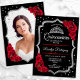 Invitation à la célébration de la Quinceanera en argent rouge noir. Caractéristiques police script, roses rouges, tiara et argent parties scintillant. Design élégant avec photo sur le dos. Parfait pour une élégante célébration de glamour de style princesse. Personnalisez avec vos propres détails. Invitations Zazzle imprimées ou téléchargement instantané modèle imprimable numérique.