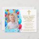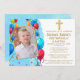 Cette mignonne invitation de premier anniversaire sert également à invitation vos invités au baptême de votre petit garçon. Le premier anniversaire comporte une photo de votre enfant sur un arrière - plan bleu aquarelle avec des pois blancs et des ballons colorés. Côté baptême, il y a du texte doré avec les détails de la messe et de la fête en or, ainsi qu'une croix d'or sur le dessus de confettis bleu aquarelle. Photographie © Storytree Studios, Stanford, CA
