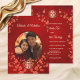 Cette élégante invitation de mariage comporte une photo ovale entourée de branches rouges en fleurs de cerisiers et un double symbole doré de bonheur sur un arrière - plan chatoyant. Noms de mariée et de mariée dans un élégant script classique.