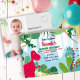 Invitation d'anniversaire personnalisée avec photo de dinosaure. Célébrez le premier anniversaire de votre bébé avec ces invitations de fête sur le thème des dinosaures colorés et mignons ! Ce design d'invitation d'anniversaire présente de mignons dinosaures colorés avec une photo de votre bébé et les détails de votre fête personnalisés en typographie moderne sur fond gris. L'autre côté des invitations présente la photo de votre bébé. Personnalisez les invitations pour le premier anniversaire en ajoutant le nom de votre fils et les détails de la fête.