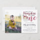 De charmantes invitations d'anniversaire d'automne pour le premier anniversaire de votre petit bout comportent "notre petite citrouille a un an" avec une citrouille blanche ornée de fleurs à la place du "o". Un design mignon et rustique pour de belles célébrations d'anniversaire automnales, vous pouvez personnaliser avec les détails de votre fête d'anniversaire ci-dessous. Ajoutez une photo préférée de la fille d'anniversaire pour un charmant effet personnel.