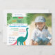 Silhouette de dinosaure turquoise mignonne et unique en combinaison avec des lettres de texte colorées, vives et joyeuses. Invitation d'anniversaire tendance, moderne et adorable pour l'anniversaire d'un petit garçon, avec photo personnalisée. Jeune, sauvage et trois ! Tous les éléments graphiques sont libres de modification !