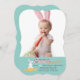 Une invitation mignonne parfaite pour une célébration d'anniversaire à Pâques mettant en vedette un lapin blanc sortant d'un œuf de Pâques décoré. Le fond sarcelle présente un motif de petits cœurs. (<a href='https://www.freepik.com/free-vector/set-of-cute-easter-cards_766176.htm'>Conçu par Freepik</a>). <br/><br/>La carte est facile à personnaliser avec votre texte, police, couleur de police et choix parmi six types de papier.<br/><br/>Pas exactement ce que vous cherchez ? Tous nos produits peuvent être conçus sur mesure pour répondre à vos besoins sans frais supplémentaires.<br/><br/>Contactez-nous simplement à heartfelthelper@gmail.com<br/><br/>Produits coordonnés disponibles :