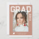 Photo Graduation Party Elégant Modern Script Invitations comprennent votre photo préférée avec le texte blanc simple "Grad (année)" et votre nom et les détails de graduation personnalisés sur le devant sur un arrière - plan brun doux. Au verso, ajoutez une image supplémentaire avec les informations sur l'invitation de graduation ci-dessous. Personnalisez en modifiant le texte dans les zones de texte fournies. Créé par ©Evco Studio www.zazzle.com/store/evcostudio