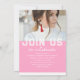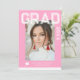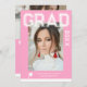 Photo Graduation Party Elégant Modern Script Invitations comprennent votre photo préférée avec le texte blanc simple "Grad (année)" et votre nom et les détails de graduation personnalisée sur le devant sur un arrière - plan rose. Au verso, ajoutez une image supplémentaire avec les informations sur l'invitation de graduation ci-dessous. Personnalisez en modifiant le texte dans les zones de texte fournies. Créé par ©Evco Studio www.zazzle.com/store/evcostudio