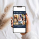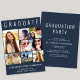 Faire-part moderne de graduation bleu foncé et invitation de fête avec "GRADUATE" en gros caractères blancs, un collage de sept photos et le nom du diplômé, l'année de classe et l'école en simple typographie blanche. Ajoutez les détails de la grande fête sur le dos.