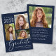 Élégante invitation à la fête de remise de diplômes en bleu avec un collage photo 3, "Graduate" dans un script blanc chic, et le nom de la diplômée, l'année de classe et l'école ou l'université en lettres blanches simples et modernes. Au verso, ajoutez une photo supplémentaire et les détails de votre fête de remise des diplômes.