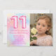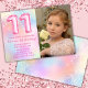 Photo Pink Rainbow 11th Birthday Invitation Girly Pink Parties scintillant 11th anniversaire invitation pour une fille de 11 ans avec écriture de script moderne et des ballons de papier amusant.