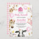 Pink Balloon Daisy Farm Anniversaire Invitation Animaux de la ferme à l'invitation d'anniversaire à thème pour une fille avec sept animaux de ferme mignons, casquettes de fête, ballons roses et grange rose.