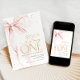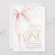 Pink bow girl's 1st birthday invitation. Modern feminine design in blush pink and gold. Features trendy watercolor coquette bow, calligraphy heart script font and modern typography ONE. Perfect for an elegant style girl's first bday celebration. Personalize with your own details. Printed Zazzle invitations or instant download digital printable template.