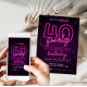 Conçue pour nos Invitations d'Anniversaire de néon rose, cette carte d'invitation personnalisable comprend du texte couleur néon, des décorations de néon et un arrière - plan violet. Éléments correspondants disponibles.