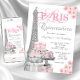 Paris Quinceanera invitation avec la belle Tour Eiffel en argent, les forfaits cadeaux parisiens élégants, les chaussures haute parties scintillant en argent et l'écriture parisienne rose sur un joli arrière - plan floral rose. Cette belle invitation à Paris Quinceanera est facilement customisée pour votre événement en ajoutant simplement vos détails dans le style et la couleur de police, et le libellé de votre choix.