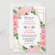 This fun and whimsical wedding invitation features watercolor pink roses and foliage on a gold geometric frame. The text combines handwritten script and serif fonts for a stylish and modern look. This is perfect for a spring or summer rustic wedding.
