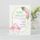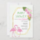 Polygone de feuille d'or, flamants roses et fleurs tropicales sauge vert bébé invitation à la douche. Il présente des flamants roses, des fleurs tropicales et des feuilles. Le texte est dans un cadre blanc avec cadre en polygon de feuille d'or. Derrière, il y a un motif à pois.