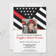 Cette invitation à la fête de remise de diplômes comporte un drapeau de pompier avec des rayures noires et blanches, ainsi qu'une mince bande rouge. Customisez avec une photo du pompier diplômé, qui est assis avant tous les détails du parti pour le pompier diplômé.