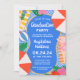 Invitation à la fête de remise de diplômes du lycée colorée, moderne et tendance. Les détails de la fête sont écrits sur l'eau bleue de la piscine en blanc. La vue aérienne montre les femmes bronzant au bord de la piscine, des parapluies rouges et blancs, des boules de plage, des fleurs tropicales et des feuilles de palmiers. Carrelage bleu et blanc fournit l'arrière - plan. Cet article fait partie de la collection Graduation Pool Party.