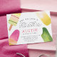 Les invitations à la fête pour la fête d'été de votre petit sont décorées de quatre illustrations de popsicle à l'aquarelle dans des tons vifs de rose et de vert citron, avec "pop on over and chill with us" en écriture de script fantaisiste. Personnalisez avec les détails de votre fête d'anniversaire sous.
