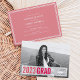 Faire-part photo tendance et moderne 2016 graduation ou invitation à la fête dans des couleurs chic présente votre portrait senior orienté paysage, avec "201X Grad" et votre nom et votre école sur une boîte blanche transparente. Les couleurs corail et rose chaud donnent à cette carte d'invitation moderne un look tendance, coloré et girly. Ajoutez les détails de votre fête à l'arrière en rose et blanc corail éclatant; ou, effacez le texte arrière pour l'utiliser comme simple faire-part de graduation. Vous avez besoin d'aide pour customiser ou vous voulez une couleur différente ? Contactez-moi via le lien "Demandez à ce concepteur" sur cette page.
