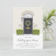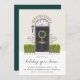Une charmante invitation à la fête de vacances présente une illustration esquissée d'une porte noire flanquée de buissons verts, avec des lettres manuscrites chic "maison de vacances". Personnalisez avec les détails de votre fête de Noël en dessous.