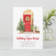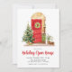 Élégantes invitations de vacances en maison ouverte avec une aquarelle illustrant une porte rouge ouverte décorée d'une couronne festive. Un sapin de Noël avec un cadeau enveloppé orne le placard avant d'un plante hivernal et d'un paquet de rondins. Personnalisez les invitations de la maison de vacances avec vos détails d'événement ci-dessous. L'invitation s'inverse pour afficher un arrière - plan rouge enneigé.