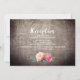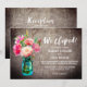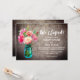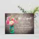 Cette carte d'invitation de réception de fuite amoureuse avec pot de fleurs en verre rustique est parfaite pour une fête de fuite amoureuse sur le thème floral country. Le design présente une élégante composition de pivoines et de fleurs sauvages en aquarelle rose pâle dans un pot en verre bleu sur un fond texturé en bois. Les cartes RSVP sont vendues séparément.