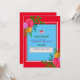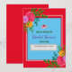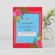 L'image affiche un modèle d'invitation à une fête de mariage vibrant bleu encadré par une bordure rouge audacieuse. Des arrangements floraux colorés dans des nuances de rose, d'orange et de jaune ornent les coins. Le design est festif et convient pour annoncer une occasion spéciale.