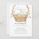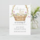 Invitation d'anniversaire avec un lapin d'aquarelle dans un panier avec tulipes et oeufs.