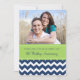 Carte d'invitation personnalisée pour une fête d'anniversaire de mariage de cinq ans dans un style amusant et moderne avec un motif chevron zigzag bleu marine foncé, vert citron clair et blanc, élégant et contemporain. Personnalisable avec les détails de votre fête et votre propre photo.