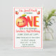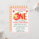 Célébrez un événement spécial avec cette adorable invitation anniversaire à thème fruit. Le design présente un charmant personnage de pêche kawaii associé à des accents floraux aquarelles doux et une typographie audacieuse et ludique. Cette invitation est parfaite pour les parents qui prévoient une fête de premier anniversaire sur le thème "Sweet Peach" pour leur petite fille.