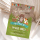 C'est un sauvage ! Profitez de cette invitation de premier anniversaire pour les animaux des bois avec un cerf mignon, un raton laveur, un ours, un renard et des champignons contre un arrière - plan de bois et d'arbre. Laissez l'aventure commencer ! !