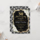 Design élégant rustique avec motif damassé noir et blanc, faux or brillant, police de caractère script et roses blanches.