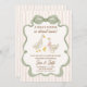 Un petit oie rigolo est presque lâché ! Une invitation adorable avec des rayures roses et des illustrations pour représenter les parents et le nouveau bébé.