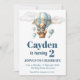 Invitation pour une fête d'anniversaire avec un ours en peluche s'envolant dans une montgolfière