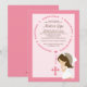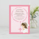 Commencez votre événement outre de la droite avec notre première invitation de sainte communion de chapelet mignon et doux. L'invitation comporte des perles d'un chapelet de rose avec la fille de cheveux de brune recevant la communion réglée sur un arrière - plan rose-clair avec une frontière rose foncée. Facile à customiser, ajoutez juste votre photo et les informations sur l'événement et vous êtes tous placez pour aller. conceptions de ©Zenware