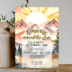 Boho et rustique conception de premier anniversaire sans sexe "Premier voyage autour du soleil" avec un paysage de style aquarelle avec des montagnes, des sapins, et un soleil levant.
