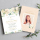 Cette élégante cérémonie de la première sainte communion et l'invitation à la fête du déjeuner pour une fille comprend un élégant libellé personnalisé pour votre événement spécial accentué par une croix d'or et une belle aquarelle fleurie avec des roses peints, des fleurs de ranunculus, et la verdure dans des tons neutres de blanc, crème, or, or rose et vert. Un arrière - plan de pêche pastel blush avec espace photo apparaît au verso de la carte. Personnalisez le texte "Dieu béni" avec le nom de votre fille dans le script.