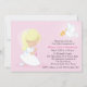 Une douce invitation à la première communion avec une petite fille blonde aux cheveux vêtue d'une jolie robe de communion blanche avec voile, agenouillé dans la prière et tenant des perles roses. L'arrière - plan est rose et il y a une colombe blanche avec branche d'or. Graphiques : https://www.etsy.com/shop/Prettygrafikdesign