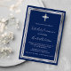Une invitation moderne, élégante et raffinée. Un arrière - plan bleu marine décoré d'une croix, de faux cadres argentés. Personnalisez et ajoutez un nom et des détails. Texte blanc.