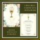 Avec une belle coutume conçue sur l'invitation de la Première Communion avec le Chalice, l'Eucharistie sainte et les fleurs rose et bleu. On y trouve la prière au Saint-Sacrement.