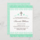 Belle première invitation de communion ou de confirmation (4,5" x 6,25") pour des filles comportant un dessus vert en bon état de frontière de dentelle/damassé et le bas et une croix de brun foncé avec des flourishes verts en bon état. Texte personnalisable d'invitation. Pour des demandes ou l'aide faites sur commande avec la personnalisation employez svp le lien de contact de magasin.