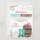 Mon premier rodéo 1er Invitation anniversaire de la petite fille. Le rodéo d'anniversaire de cette fille à thème occidental présente une palette de couleurs rose et turquoise avec des bottes de cowboy, casquette cowboy, tonneau rustique et un décor occidental. Idéal pour la fête du premier anniversaire d'une cowgirl.