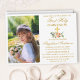 Elégant moderne Première Communion Invitation avec Croix et Photo. La flore de l'aquarelle comprend des roses de pêche, des fleurs blanches et de la végétation botanique. Script Gold.