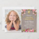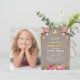 Invitation pour la première communion des filles avec un fond en bois rustique, une photo de votre enfant, des paillettes dorées dispersées, un joli décor floral aquarelle rose, un titre en lettrage doré, une croix religieuse et un modèle de sainte communion facile à personnaliser.