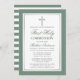 Elégant moderne Première Sainte Communion Invitation avec Croix. Sage Green et White Stripes. Croix d'argent.