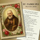 Belle image de Saint Padre Pio tenant sa Bible ou son livre de prière encadrée dans un magnifique design floral & dentelle. Une puissante prière à St. Pio est à l'arrière.