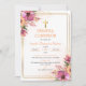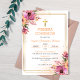 Celebra la Primera Comunión Sagrada de tu hija con esta invitación a las flores rosadas y una cruz dorada. Perfecto para una Primera Comunión Católica. Español / Español : Celebra la Primera Comunion de tu hija con esta invitación.