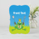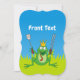 Grenouille Prince avec outils barbecue, tongs et spatule sur herbe verte sous ciel bleu.