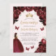 Cette jolie invitation de la quinceañera comporte une bordure de fleurs d'aquarelle bordeaux sur un arrière - plan bordeaux pâle. Une tiare dorée, une fille aux cheveux foncés en robe de princesse bordeaux et de petits papillons bordeaux ornent le texte. Le mot "Quinceañera" et le nom de l'invité d'honneur apparaissent dans un élégant script d'écriture manuscrite de couleur or, avec le texte restant en gris sans serif.