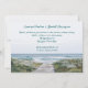 Invitation de mariage avec une image de promenade en planches à travers la végétation côtière. Une mer calme est visible au bout du chemin en planches. Le texte est imprimé au-dessus de l'horizon dans une couleur bleu-vert. Cette police de caractères script semble être comme si l'invitation avait été écrite à la main à l'aide d'une plume ancienne. Cela donne un aspect très unique, avec un espace pour les noms complets ou les prénoms en haut en plus gros caractères. Le reste des informations sur la cérémonie, avec réception et / ou formulation de réponse si nécessaire. Veuillez utiliser l'outil de conception pour changer la police si vous avez besoin de quelque chose de différent ou me contacter. Le papier feutré présenté est l'un des nombreux choix de papier disponibles.