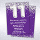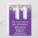 Purple and silver 11e invitation anniversaire 11 invitation fête d'anniversaire pour un noir blanc argenté avec écriture de script moderne et ballons de papier d'aluminium amusant.